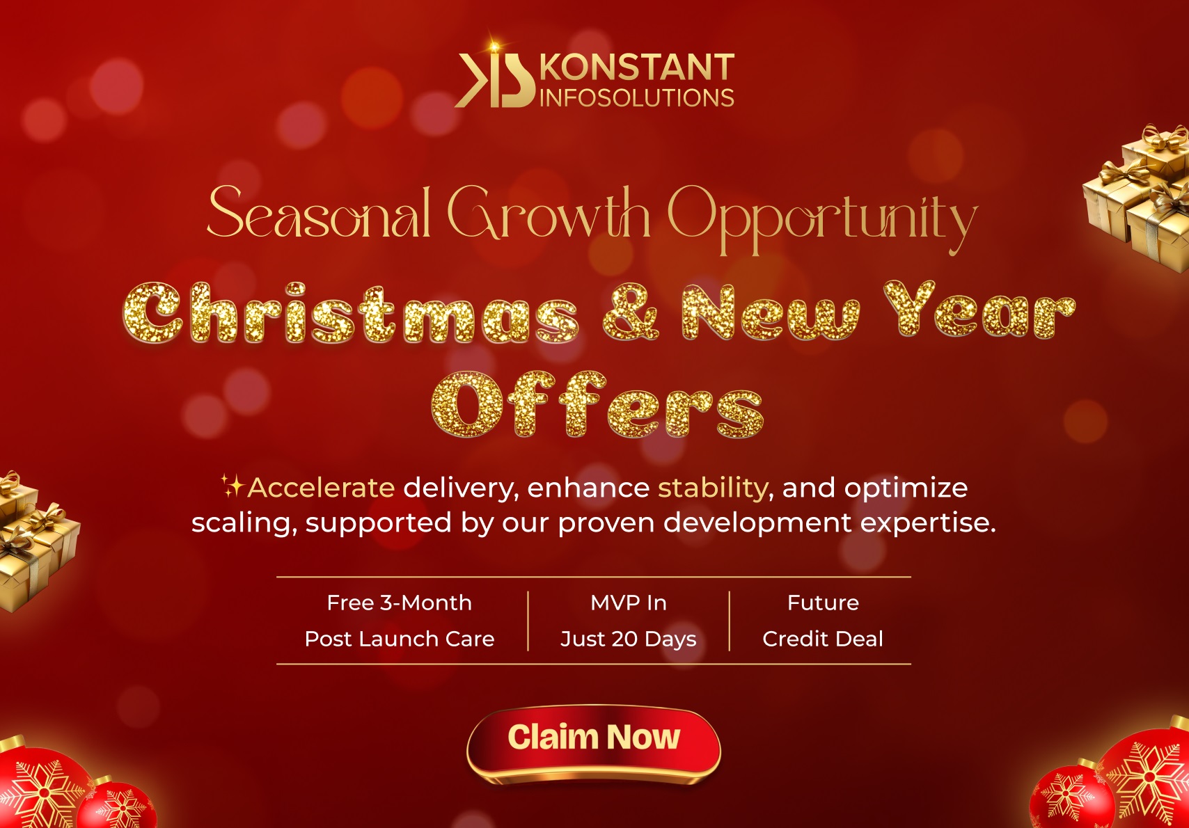 Celebrate Christmas & New Year with exclusive software development deals from Konstant Infosolutions. Get web & mobile app development, MVP in 20 days, AI solutions, and free 3-month support.