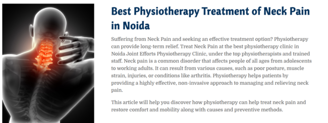 Suffering from Neck Pain and seeking an effective treatment option? Physiotherapy can provide long-term relief. Treat Neck Pain at the best physiotherapy clinic in Noida Joint Efforts Physiotherapy Clinic, under the top physiotherapists and trained staff. Neck pain is a common disorder that affects people of all ages from adolescents to working adults. It can result from various causes, such as poor posture, muscle strain, injuries, or conditions like arthritis. Physiotherapy helps patients by providing a highly effective, non-invasive approach to managing and relieving neck pain.