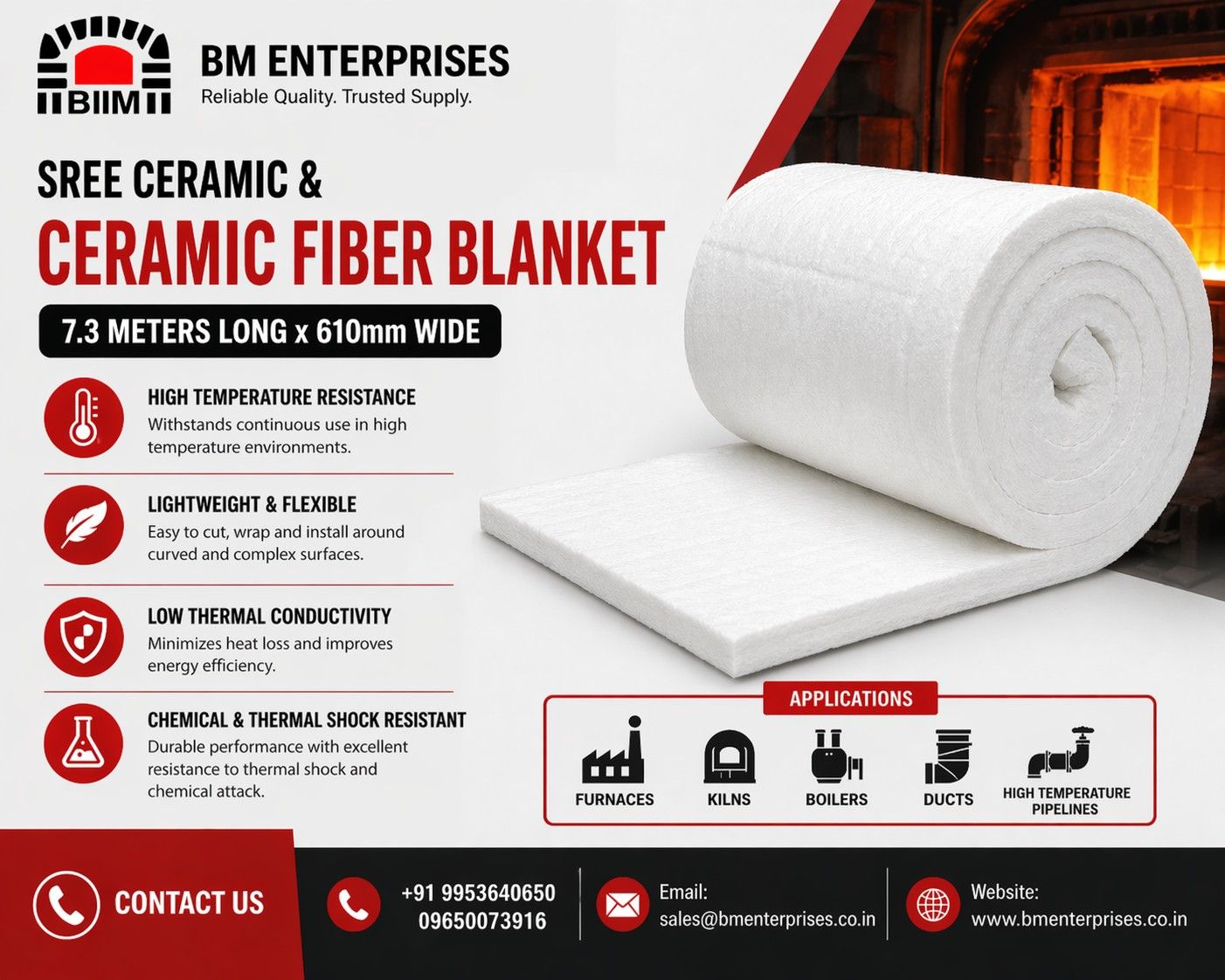 BM Enterprises provides a Sree Cera Ceramic Fibre Blanket that is 7.3 meters long and 610 mm wide. The product is highly durable and performs well in resisting temperature extremes. Made from top-quality alumina-silica fibre, it offers excellent insulation and can withstand extremely high temperatures without compromising its integrity. The blanket can be easily wrapped and installed on any surface and, therefore, can be used for wrapping furnaces, kilns, boilers, ducts, and high-temperature pipelines. Apart from being an effective insulating material, the ceramic fiber blankets demonstrate high resistance to thermal shocks and chemical influences. That means that the blanket will not only resist temperatures, but also will have prolonged use as it will not get damaged under any conditions. It is widely applied in such industries as steel, cement, petrochemical, power generation, etc., where heat management plays a crucial role. Contact us now for a quick consultation and quotation for your project!  Call: +91 9953640650, 09650073916,